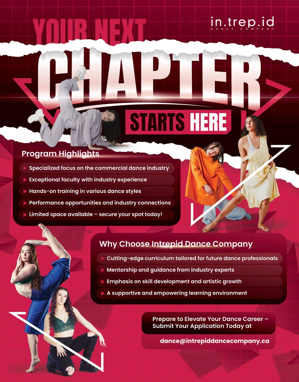 Canada's Breakthrough Commercial Dance TrainingThe Intrepid Dance Company post-secondary program is Canada’s first full-time training program designed specifically for dancers pursuing commercial careers. This isn’t just dance class — it’s career preparation.